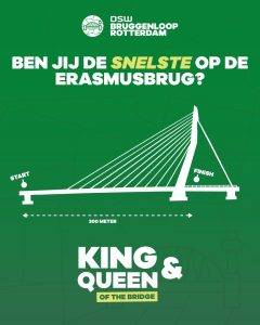 De DSW Bruggenloop Rotterdam introduceert tijdens deze editie een compleet nieuwe uitdaging voor alle deelnemers: King & Queen of the Bridge Challenge. Een extra klassement dat jouw kracht en snelheid test op het meest iconische punt van de route, de beklimming van de Erasmusbrug.