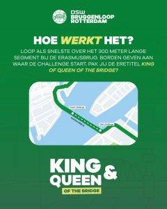 De DSW Bruggenloop Rotterdam introduceert tijdens deze editie een compleet nieuwe uitdaging voor alle deelnemers: King & Queen of the Bridge Challenge. Een extra klassement dat jouw kracht en snelheid test op het meest iconische punt van de route, de beklimming van de Erasmusbrug.